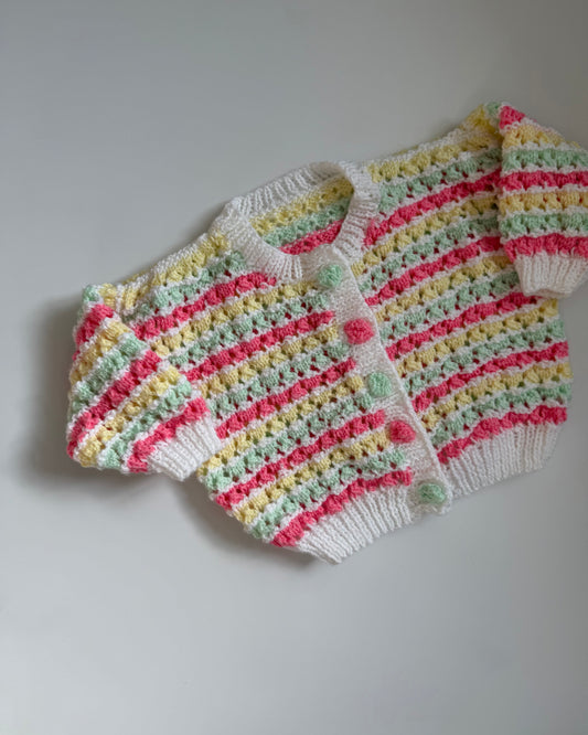 Hand-knitted pastel stripe cardigan bobble buttons 6–12m
